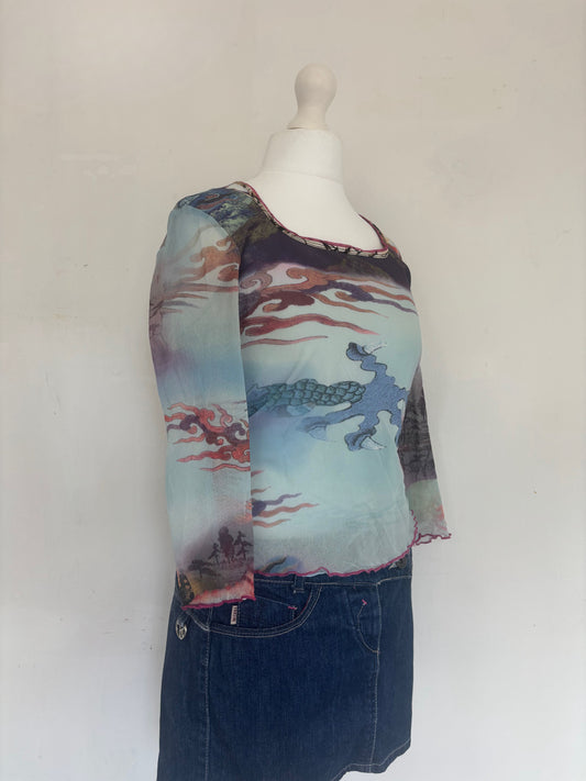 Blue Dragon Print Mesh Long Sleeve Top